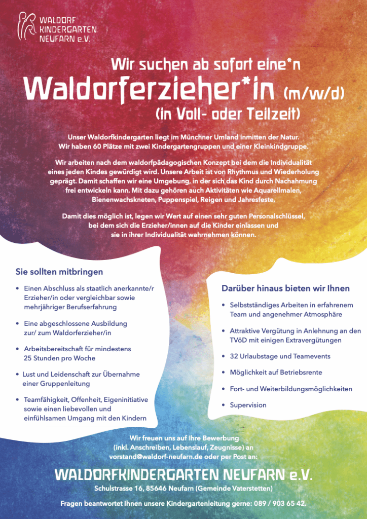 Stellenanzeige-Kategorie: Erzieher*inStellenanzeige-Schlagwörter: Teilzeit Vollzeit